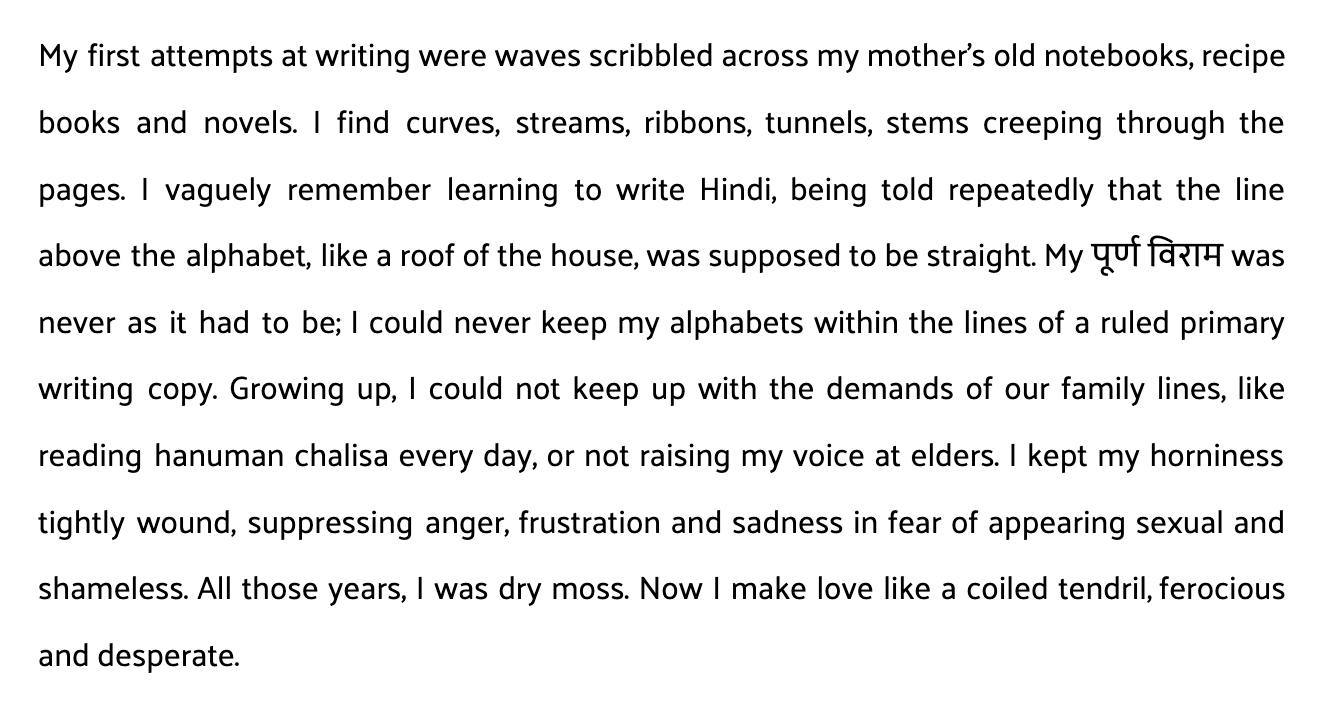 Shadows take over as I walk through. Dark tree foliage hovers over me, and banyan roots hang around. Winter trees, leafless, extend over the landscape like tunnels. All materials at once become transferable, porous, in the darkness. Shadows streak through the gravel path while flowerless snake plant varieties or wild dracaenas growing in bunches spread through the land, tentacular. The park is mostly empty at this hour, and there are unlit patches where I am surrounded by dark bushes on both sides. On these sterile winter evenings, I walk alone and forget that I am a woman. In my father’s family, women are only as good as their expendable bodies. My paternal grandmother, on a perfectly ordinary Sunday, yearns for an uneducated daughter-in-law (8th pass, she says) in place of my mother, so she would never leave the house or work a job, to serve her at home all day. I end the walk prematurely after the second round, as I can see no one else in the park. Darkness can help me disappear, can never make me forget I am a woman in this world.